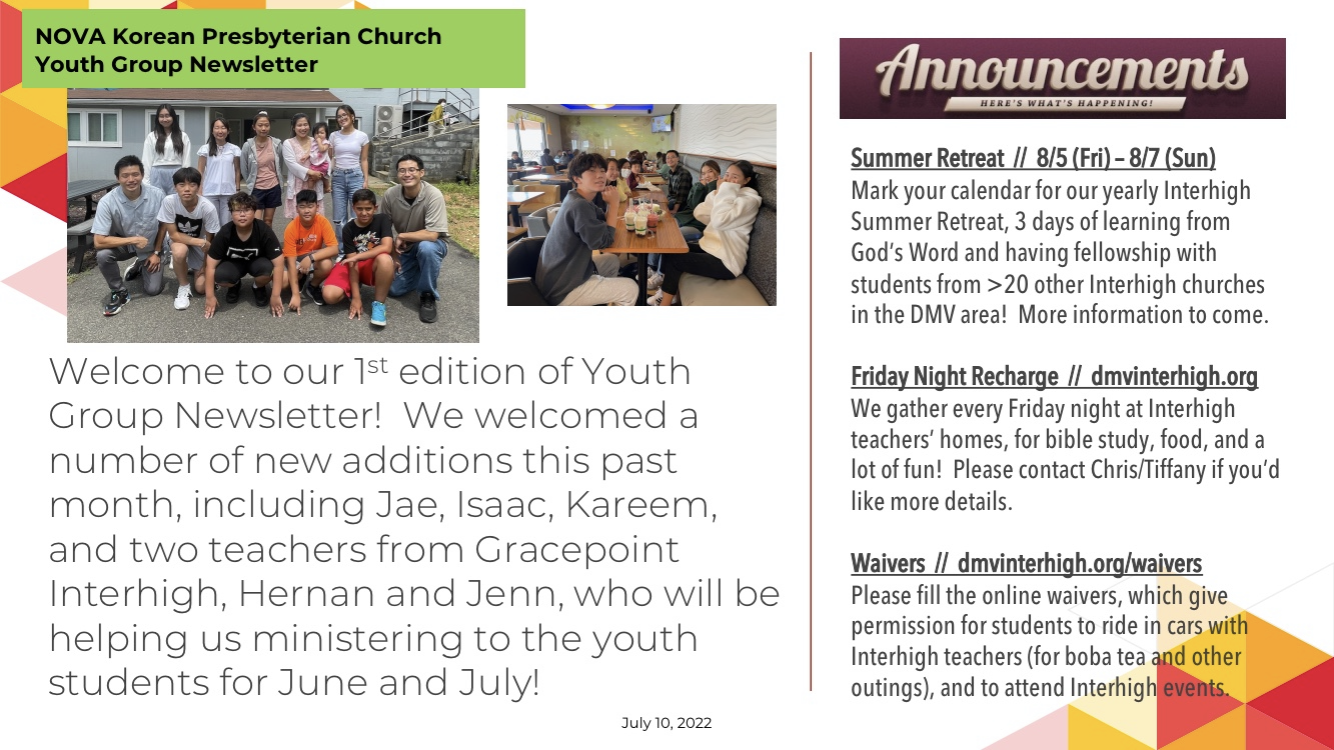 오뚜기 구역의 사랑으로 오늘도 행복이 시작됩니다. 정성껏 준비한 음식들이 우리들의 입가에 미소를 짓게 합니다. 행복입니다. 주님의 부르심으로 함께하여 교회를 세워가는 모습들이 참으로 귀합니다. 오늘은 멀리 플로리다로 이사를 간 Andy 청년이 방문을 하여 그 기쁨과 반가움이 더 했습니다. 교회는 우리들의 마음의 고향입니다. ~~ 뛰어 노는 아이들의 모습 ^^ 믿음으로 자라가는 유스들의 활동 ~~ 함께 하면서 섬기는 선생님들의 노고가 있어 함께 우리는 오늘도 교회를 지어갑니다. 토요일에는 본당 라이트 작업 및 엠프 시설을 정리하였습니다. 수고하는 손길들이 정말 귀하고 고맙습니다. ~ 오늘도 우리의 존재로 인해 행복합니다.